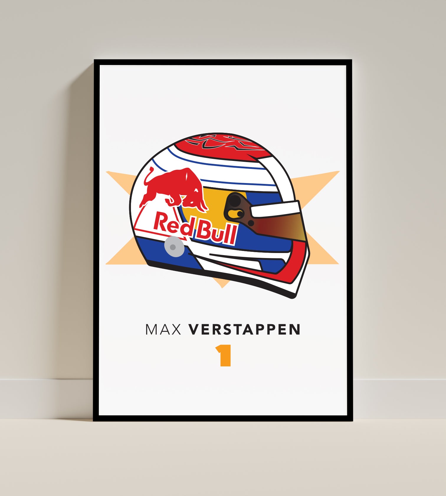 🏁 Get ready to rev up your walls with this eye-catching Max Verstappen helmet print. Order now to add a piece of the track to your collection!